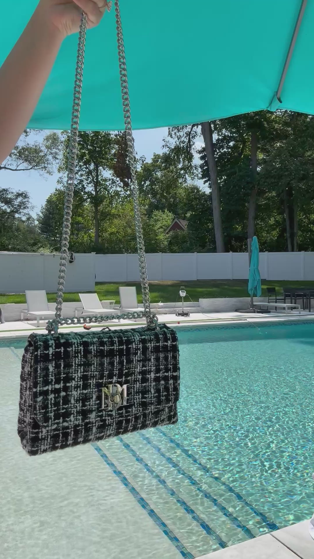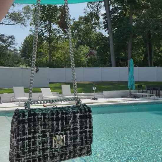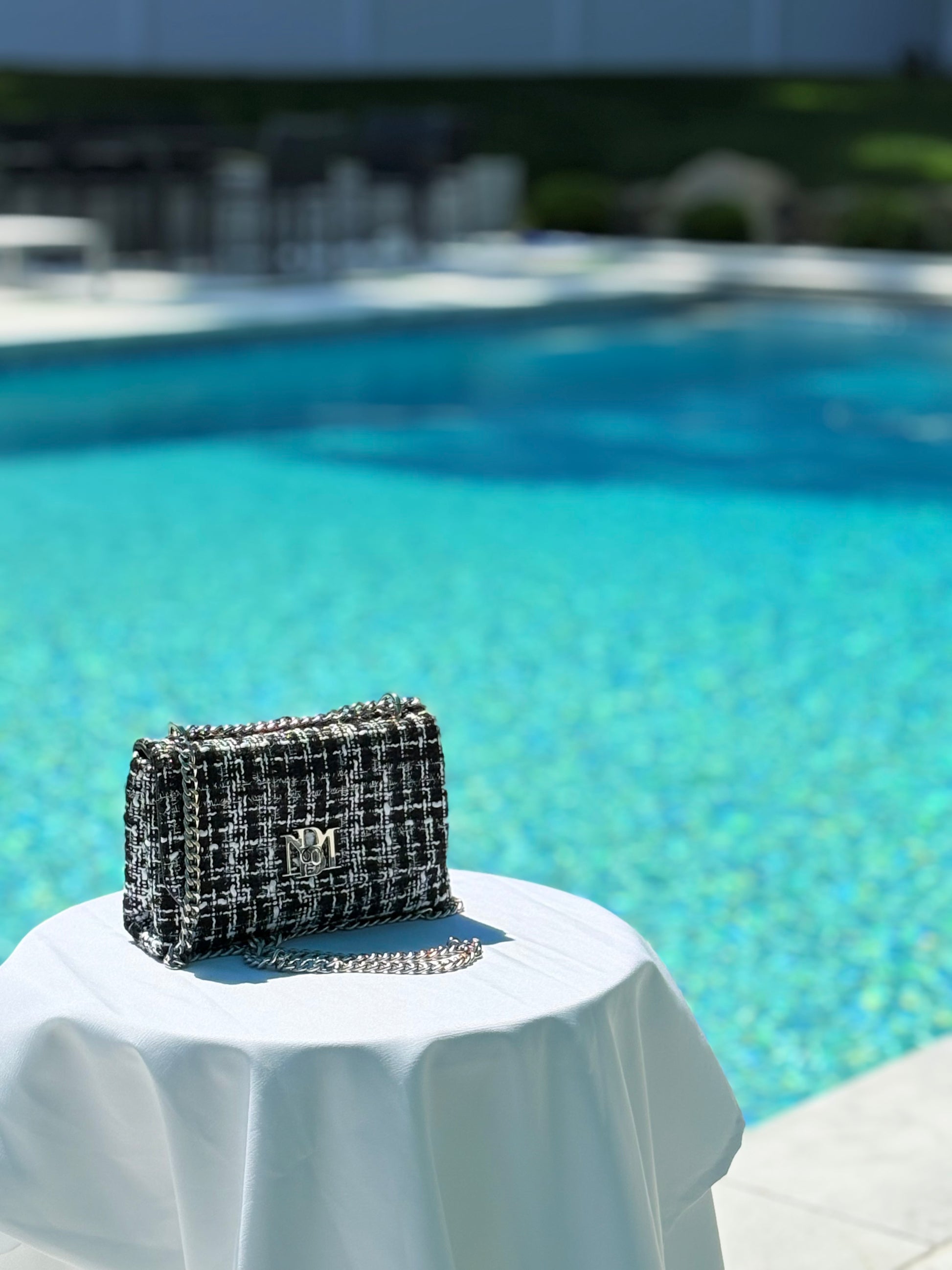 Elevate your fall/winter look with our Badgley Mischka Tweed bag. The double compartment design, crossbody-shoulder style, and silver chain strap make it both practical and stylish. Complete with silver hardware for a touch of luxury. Perfect for the fashion-conscious looking for effortless sophistication.