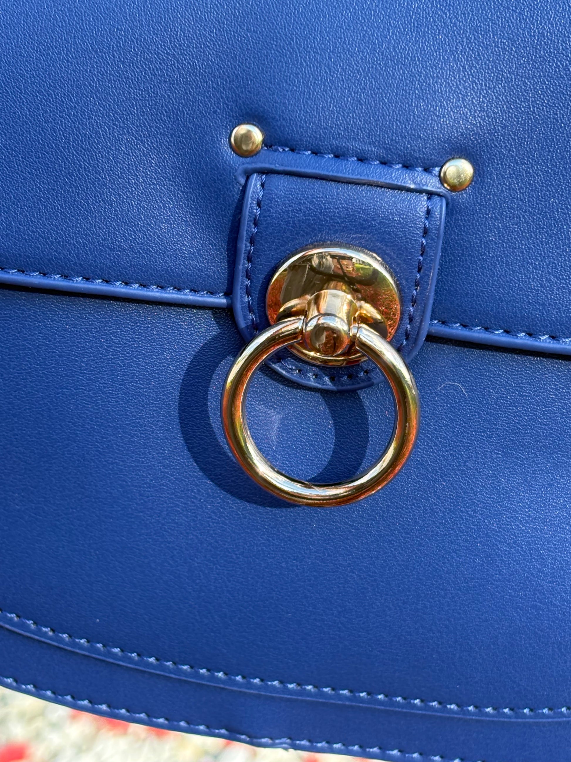 Introducing our luxurious Badgley Mischka saddle bag, crafted in exquisite blue vegan leather. With stunning gold accents, including a bold ring clasp, this bag is both sophisticated and functional. Perfect for everyday wear or special occasions. Approximately 9” x 7” x 3.6”