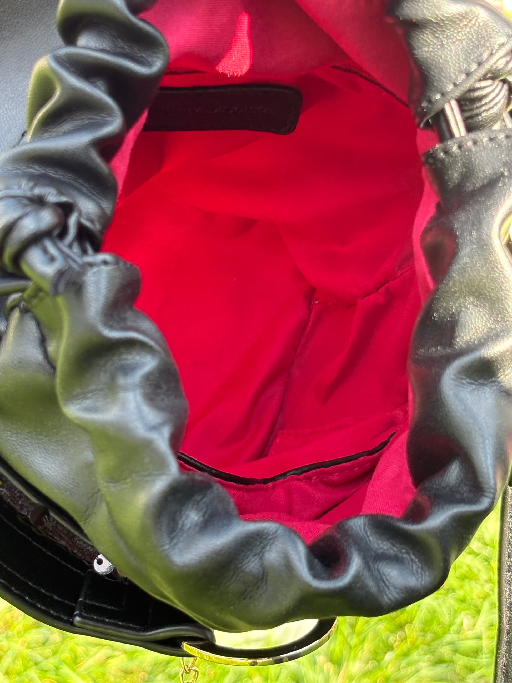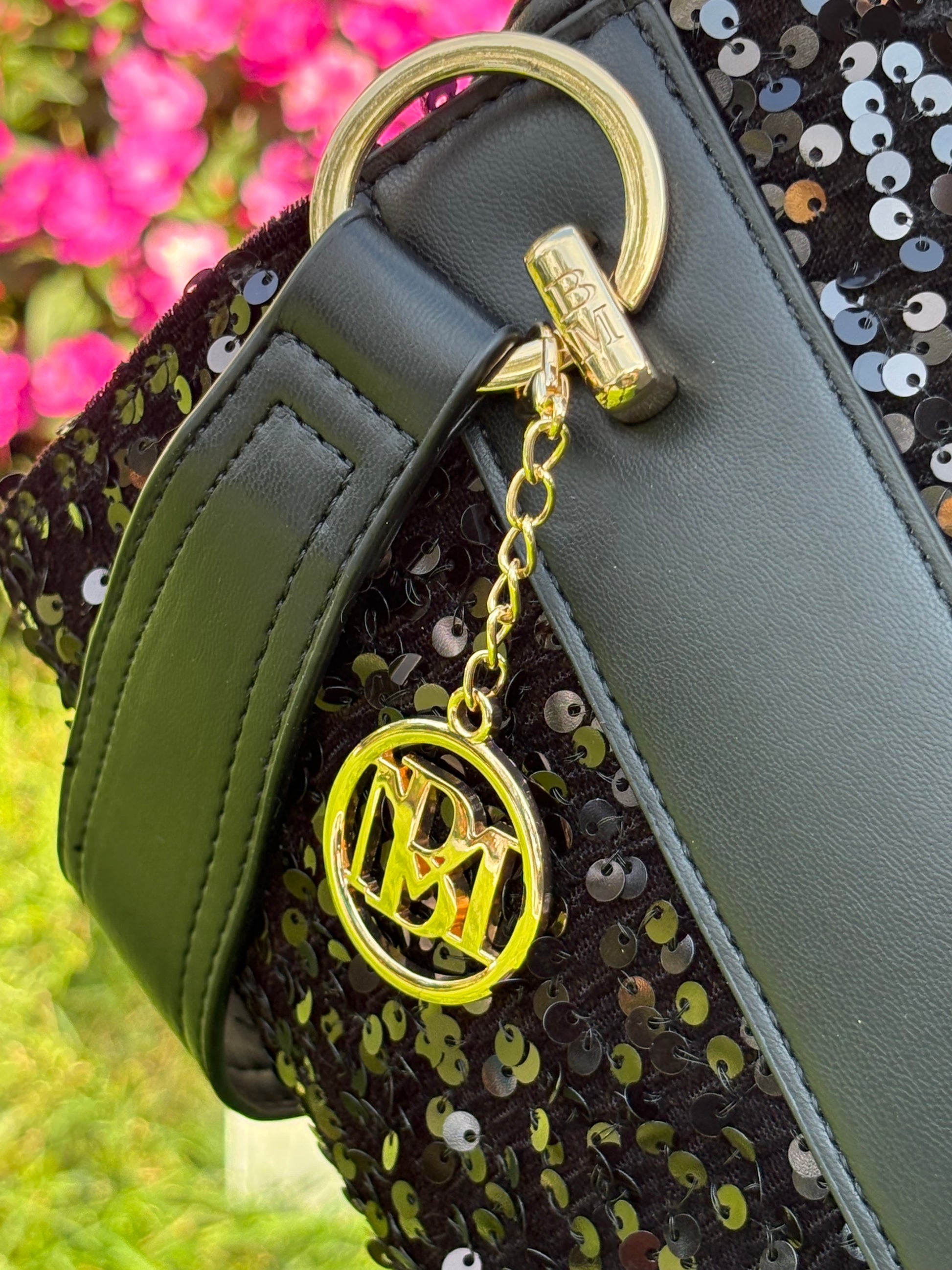"Add a fun, playful touch to any outfit with the Badgley Mitschka Black Sequin Bucket! Featuring a top drawstring closure and goldstone hardware, this bag also offers practicality with an inside zip pocket and slip pockets. With a top handle and removable crossbody strap, it's the perfect statement piece for any occasion. Measures 6.5"x6.5"x5.5". Grab yours and shine on!"