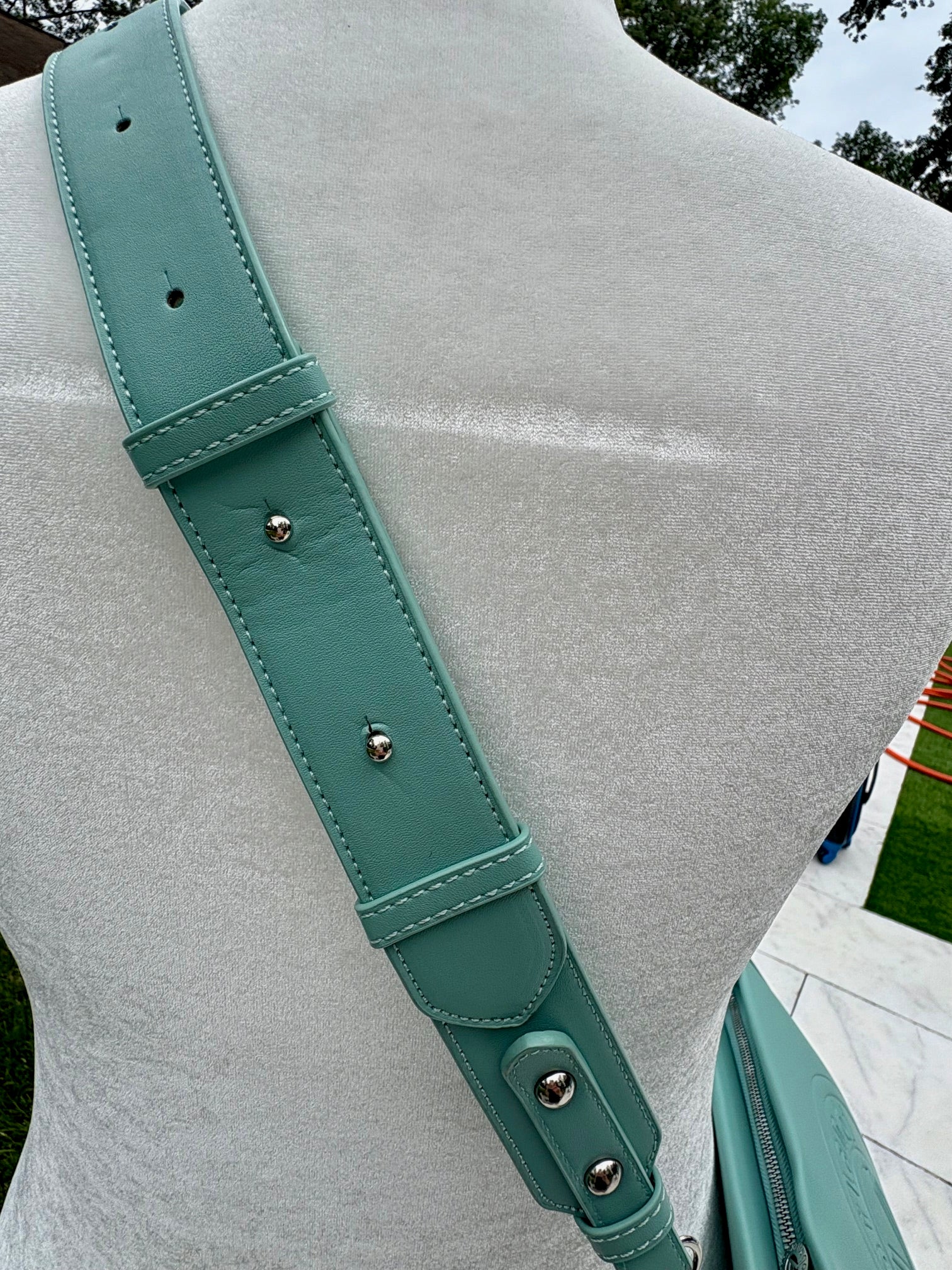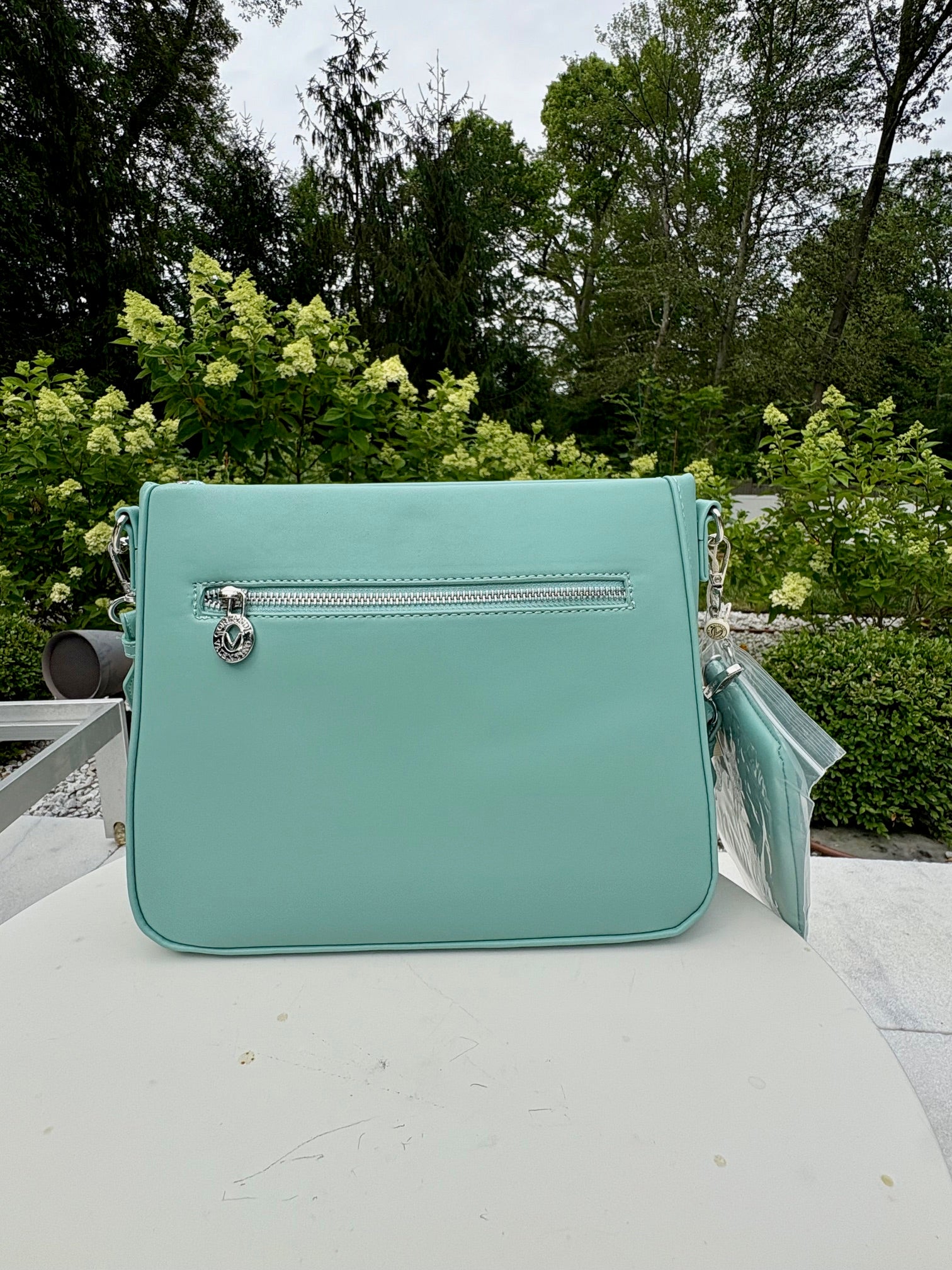 Discover the refined elegance of this large crossbody bag from Valentino Orlandi. Crafted from luxurious vegan leather in a sophisticated Tiffany blue shade, this bag combines classic style with ethical sophistication. Complete with an adjustable and detachable crossbody strap for convenience, a zipper closure, exterior back zippered pocket, and satin lining interior, it's the perfect blend of fashion and function. Adorned with silver tone metal hardware and equipped with detachable wallet, this bag is the ultimate statement in premium accessories. 10” x 8.5” x 3” approximately